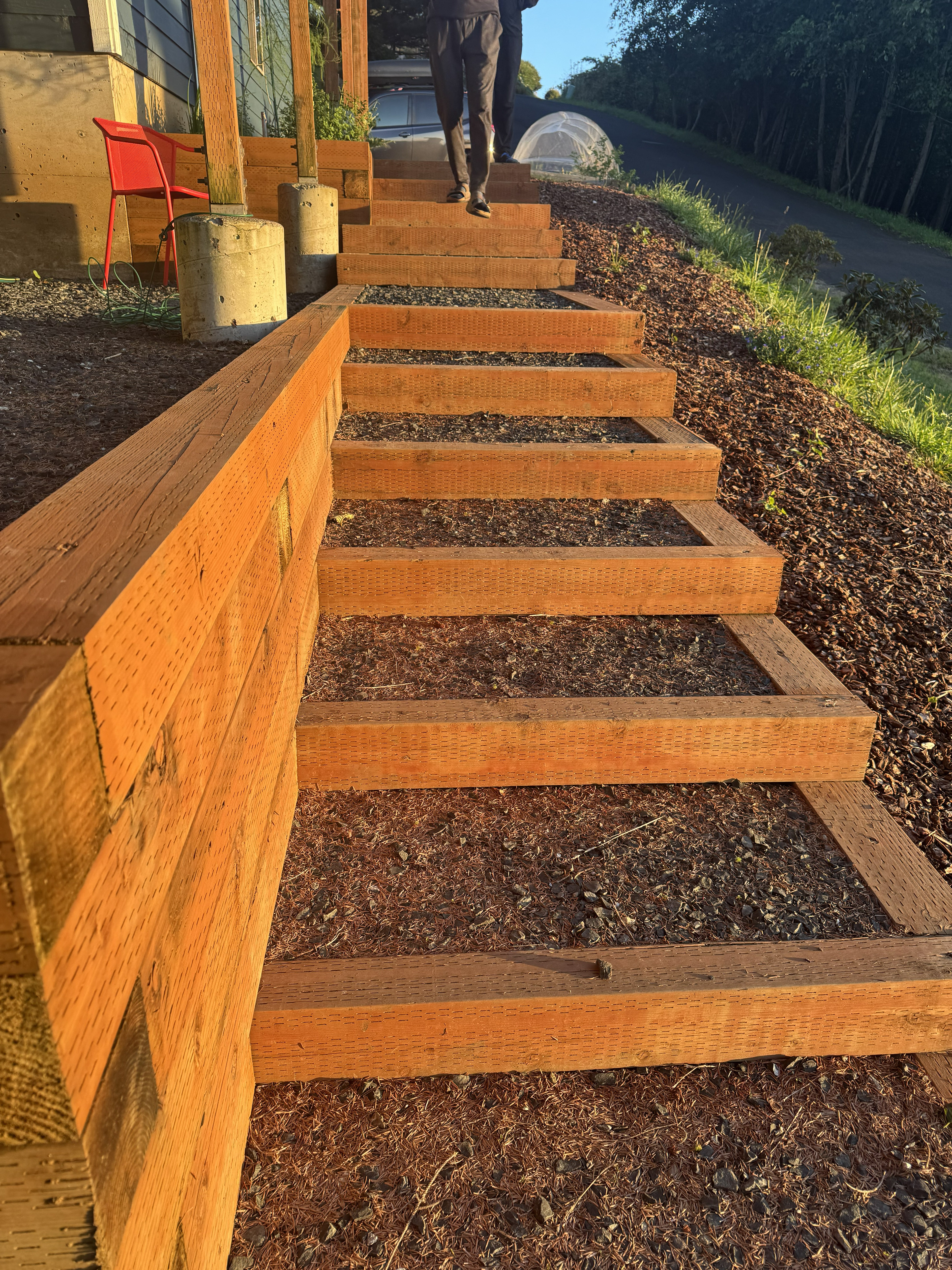 This Oregon Coast retirement home celebrates native flora and outdoor living. With guidance from Artemill, the homeowners planted the garden themselves. Redwood steps, crafted with the help of skilled craftspeople, connect the yard’s different levels, blending seamlessly with the plantings and terrain.