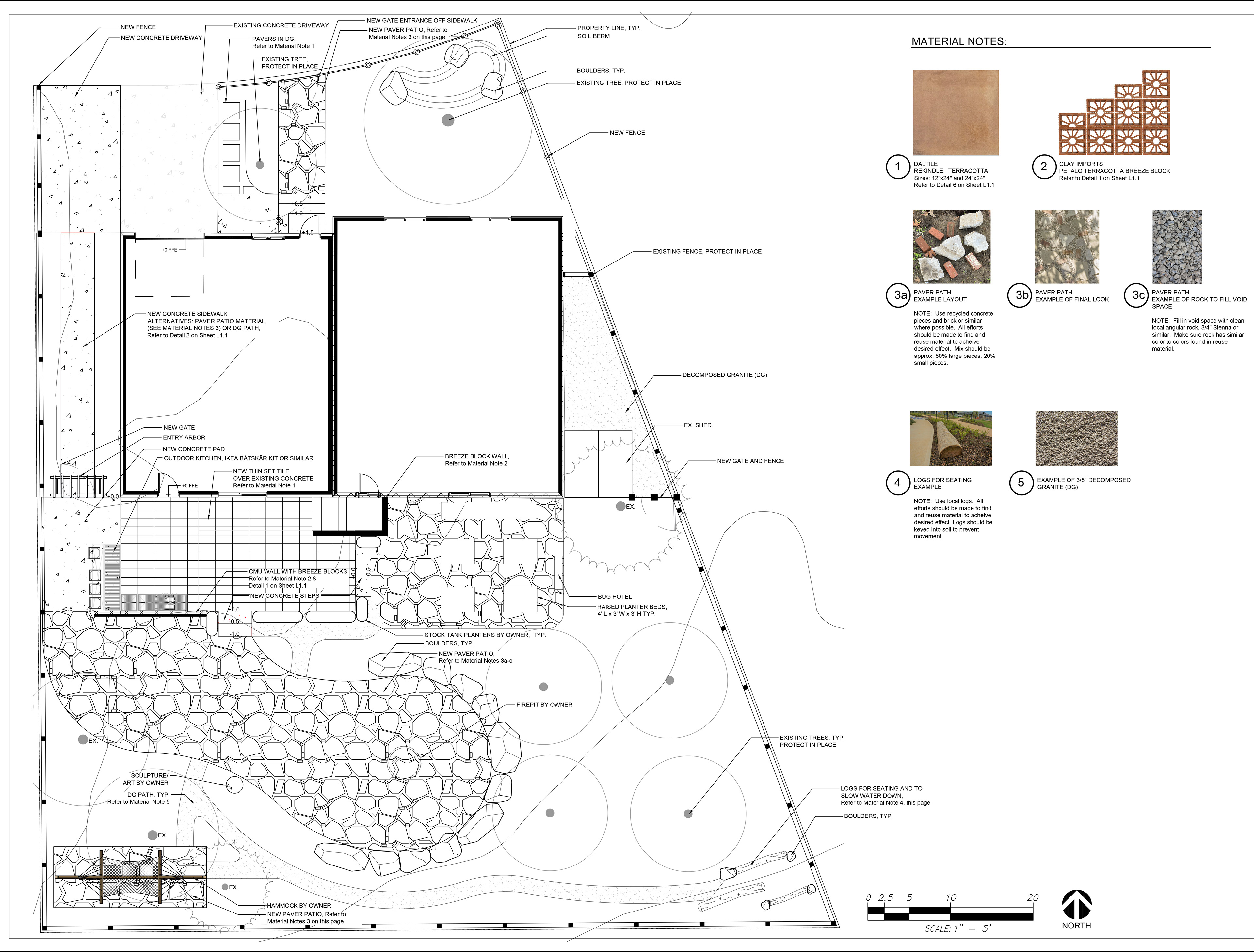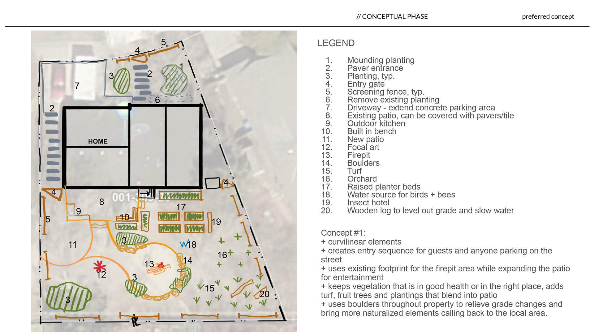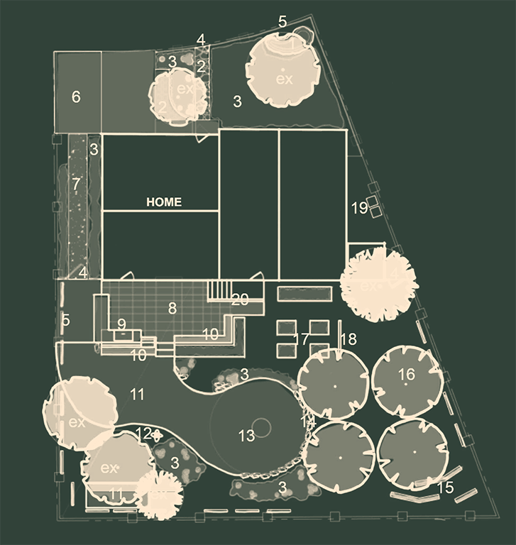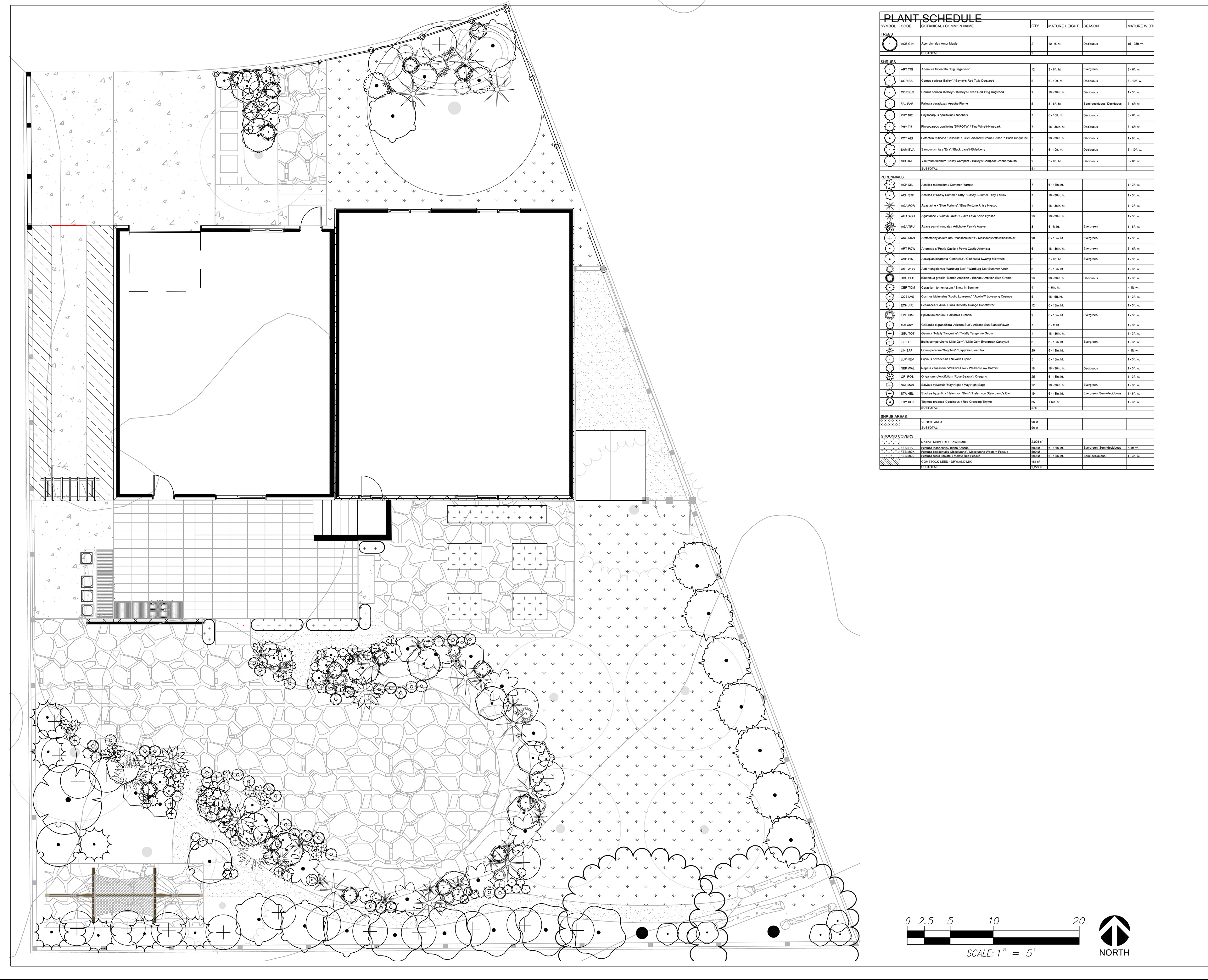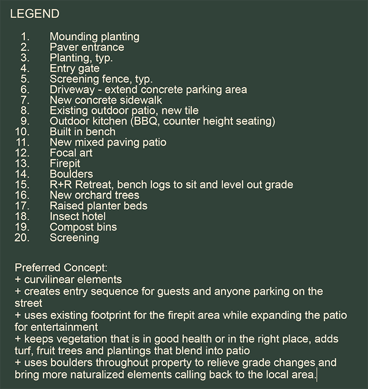 This Reno yard is being thoughtfully reimagined as an ecologically minded landscape that spans the entire property. The design focuses on native and adapted plantings to create habitat for birds, bees, and beneficial insects, while curvilinear patios and gathering spaces aim to foster connection for the homeowners and their guests. Inspired by the surrounding Sierra Nevada foothills, the plan balances natural textures, stone, timber, and metal with modern design elements to reflect the local mountain landscape. The concept is a true collaboration: the creative homeowners are actively involved in shaping the design, and the plan anticipates where experts may assist with complex installations such as patios, firepit areas, and structural elements. Existing materials and furnishings are incorporated where possible. This project demonstrates how a thoughtful, collaborative approach can translate the vision of a whole yard into a functional, beautiful, and wildlife-friendly landscape.