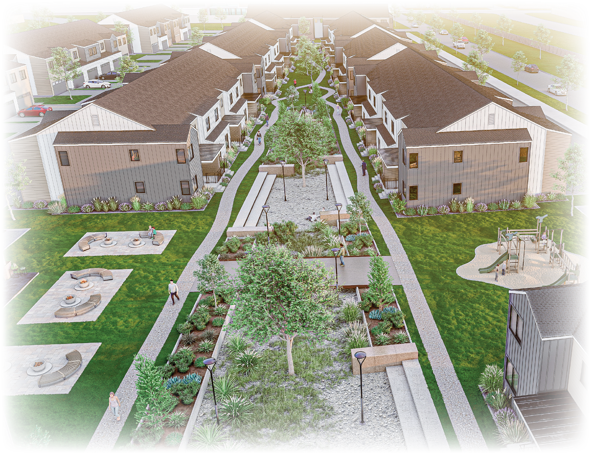 Retention basins are shaped as shared open-space amenities, providing both ecological function and everyday usability. A themed playground and thoughtfully placed planting areas encourage community interaction and a sense of belonging.
