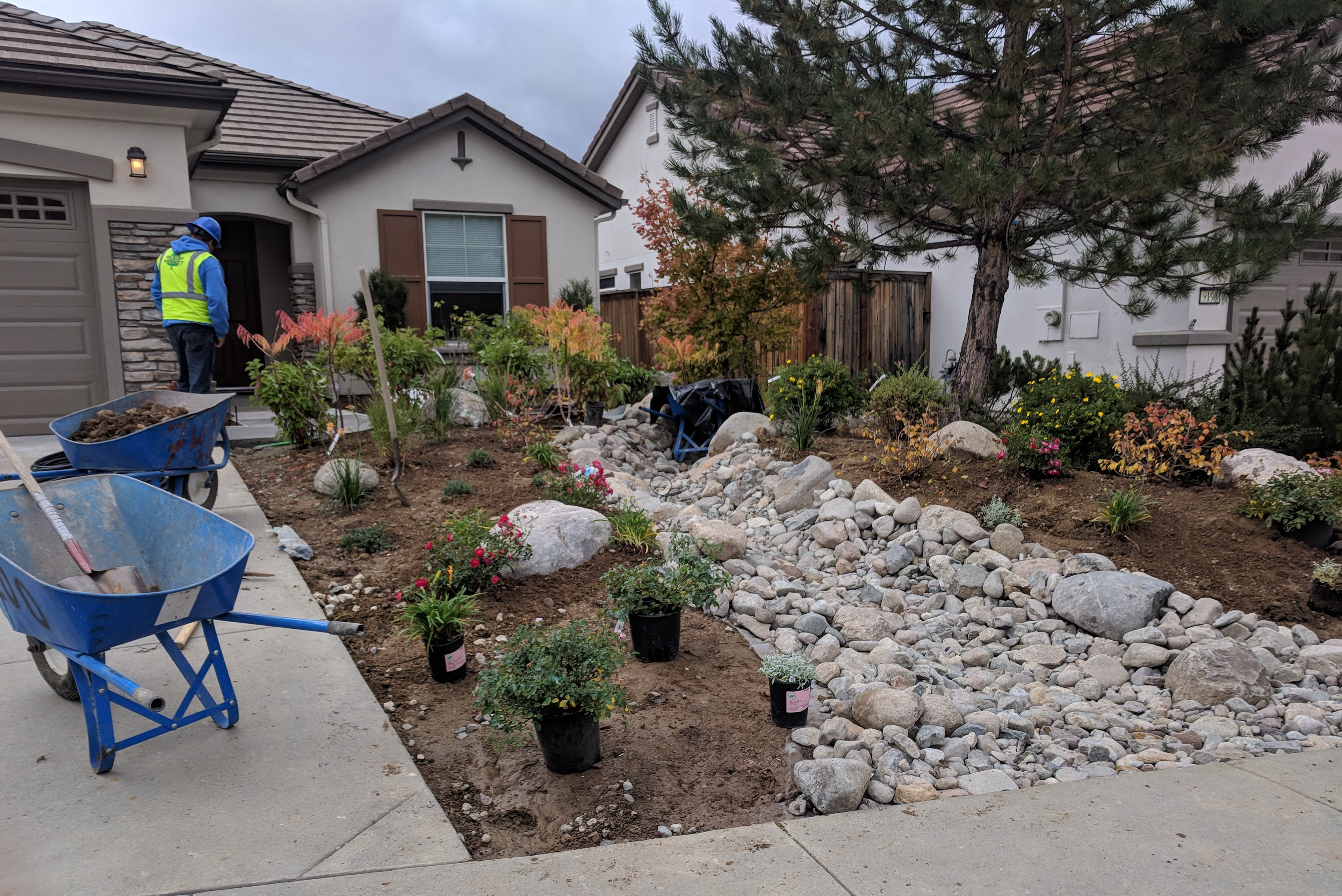 This front yard in Reno was reimagined as a water-wise, welcoming landscape that meets HOA requirements while addressing longstanding drainage issues. The design removes the existing turf and replaces it with a xeriscape planting palette selected for four-season interest and year-round structure. A naturalized dry river bed manages stormwater and guides runoff away from the home, creating both function and visual movement. A small front patio—screened by layered plantings—offers a private place to enjoy morning sun and connect with neighbors. The result is a resilient, low-water landscape that improves drainage, enhances curb appeal, and supports a more sustainable approach to front-yard living.